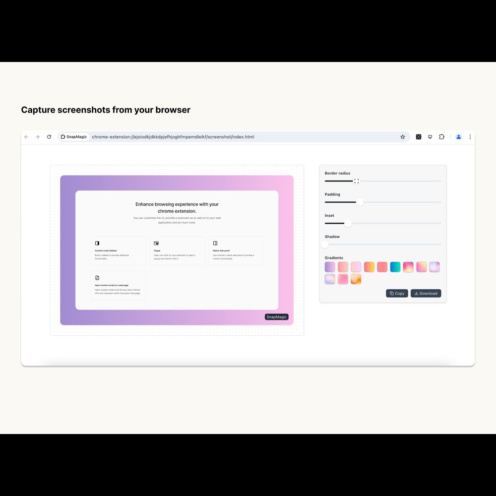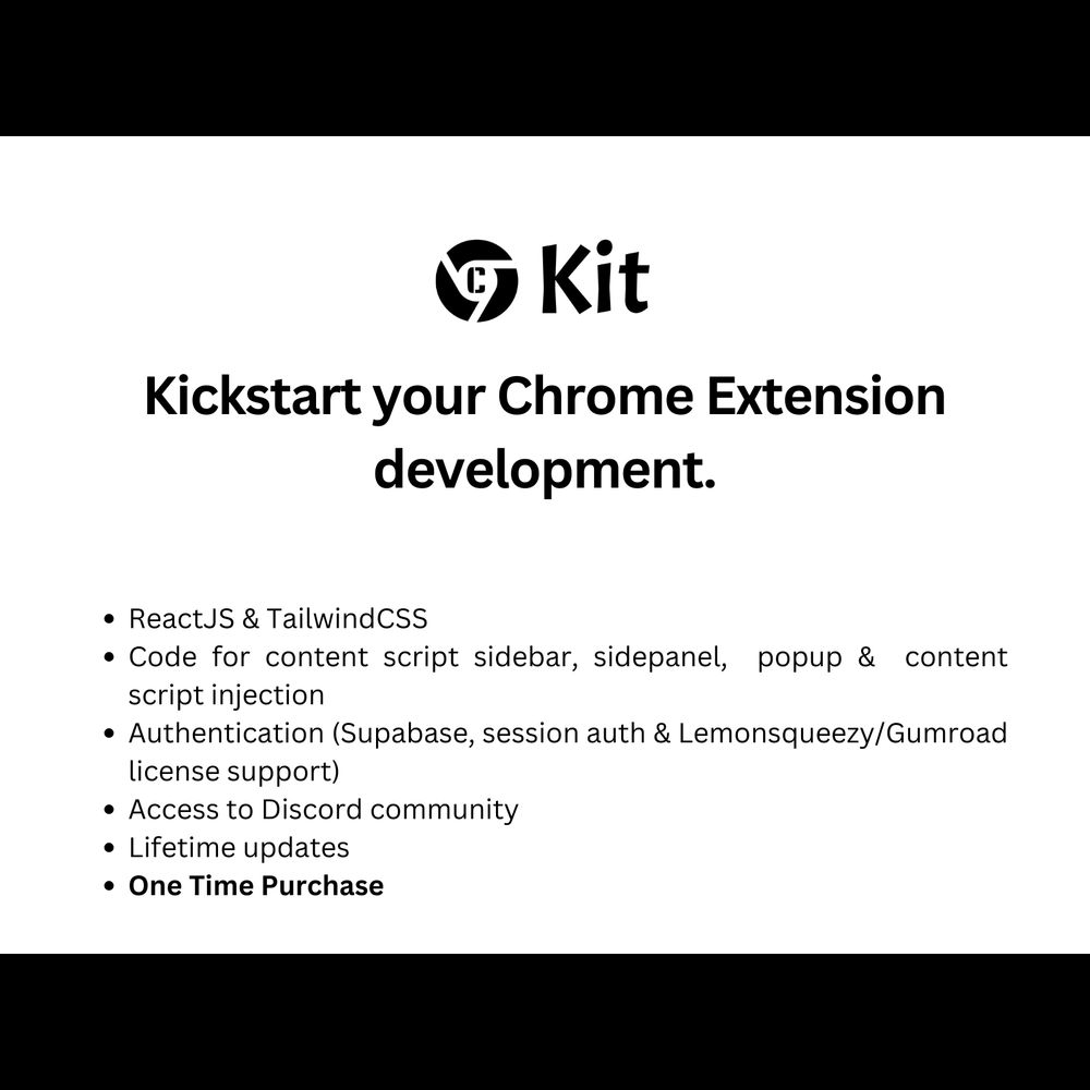 Don't spend a ton of time building a chrome extension. Use this boilerplate code to kickstart your extension development. What you will get: Extension boilerplate code. (Code in React.js and TailwindCSS.)Boilerplate code forContent script sidebarNative sidepanelContent script injectionPopupContent script sidebar in an iFrameTwitter template (To help you build extensions on Twitter's tweets)Authentication in extension.Supabase integrationSession basedSupport for Lemon squeezy/Gumroad licenseExample of message passing (One time and long lived connections).Re-inject content scripts on extension update.Help with creating your product in chrome web store. (Figma/Canva template for your extension icon & screenshots.)Access to Discord community to help you build your chrome extension.Lifetime updates. Use your GitHub email to subscribe. It will be easy for me to provide you access to the code. Purchase the boilerplate only if You know how to write code using ReactJS and TailwindCSS.You don't know ReactJS/TailwindCSS but are fine using it for building your chrome extension.